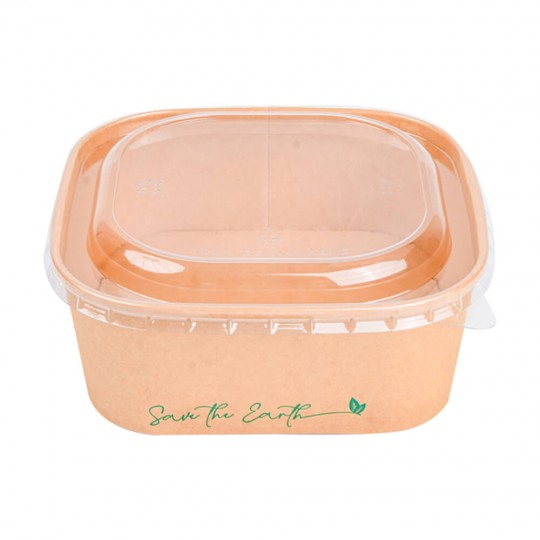 Ensaladera de papel desechable con tratamiento impermeabilizado antigrasa con tapa. Apto para productos con salsas, aceites, etc. La tapa está fabricada en plástico PET, no es apta para microondas, pero aguanta el calor hasta 70 ºC, en congelación puede usarse hasta -40 ºC. Capacidad de 1.000 cc. Son económicos, resistentes, rígidos y con buena resistencia térmica. Nuestros ensaladeras de papel cuadradas son la alternativa sostenible y práctica para catering, take away y fiestas, sin comprometer la calidad de tu presentación y respetando el medio ambiente.